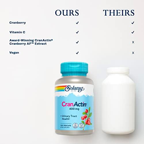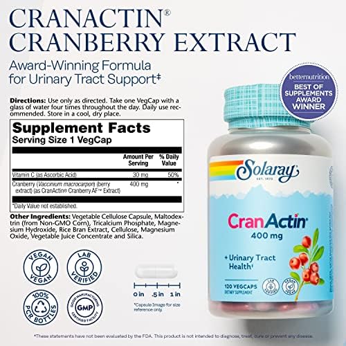SOLARAY Cranactin Cranberry AF Extract Capsules, 400 mg, 180 Count (120 CT) admin, August 4, 2023 Price: $29.49 - $21.99(as of Aug 04,2023 07:42:22 UTC – Details) Warning: Do not use if safety seal is broken or missing. Keep out of reach of children. Keep you licensed health care practitioner informed when using this product. Is Discontinued By Manufacturer : No Product Dimensions : 2.31 x 2.31 x 4.38 inches; 4.16 Ounces Item model number : 076280008418 Date First Available : June 4, 2004 Manufacturer : SOLARAY ASIN : B00020I1XG Concentrated Formula: Providing 400 mg of CranActin Cranberry AF Extract per serving, our cranberry capsules offer the benefits of drinking pure cranberry juice without the added sugar or calories.Vitamin C Immune Support: CranActin also contains Vitamin C to help support immune health and antioxidant processes in the body*.Eco-Friendly: Committed to a cleaner planet, we use 100% PCR bottles made from plastic removed from oceans & landfills and have partnered with One Million Trees, an organization dedicated to global reforestation.Trusted Brand: We manufacture products and test ingredients in our own state-of-the-art lab in Utah to ensure purity and potency. Because we believe in the quality and efficacy of our products, each bottle comes with a 60-day money-back guarantee. Health News